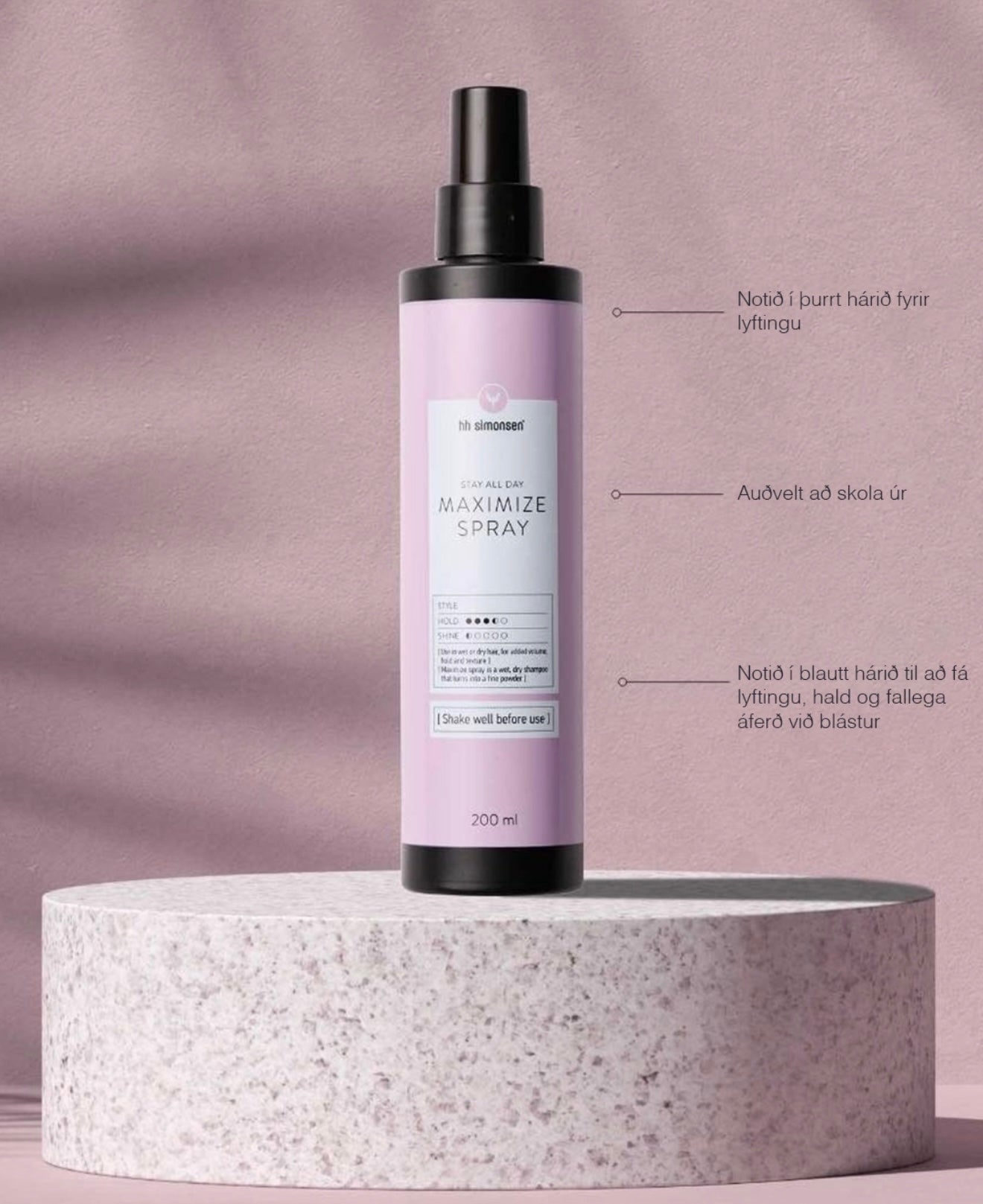 Maximize Spray frá HH Simonsen er blautt þurrsjampó sem gefur lyftingu og fyllingu og hentar öllum hárgerðum. Hægt að nota í blautt hár til að gefa lyftingu við blástur eða í þurrt hár fyrir náttúrulega áferð. Fullkomið til að gefa hvaða greiðslu sem er lyftingu og áferð eða fyrir hið fullkomna „messy“ útlit.