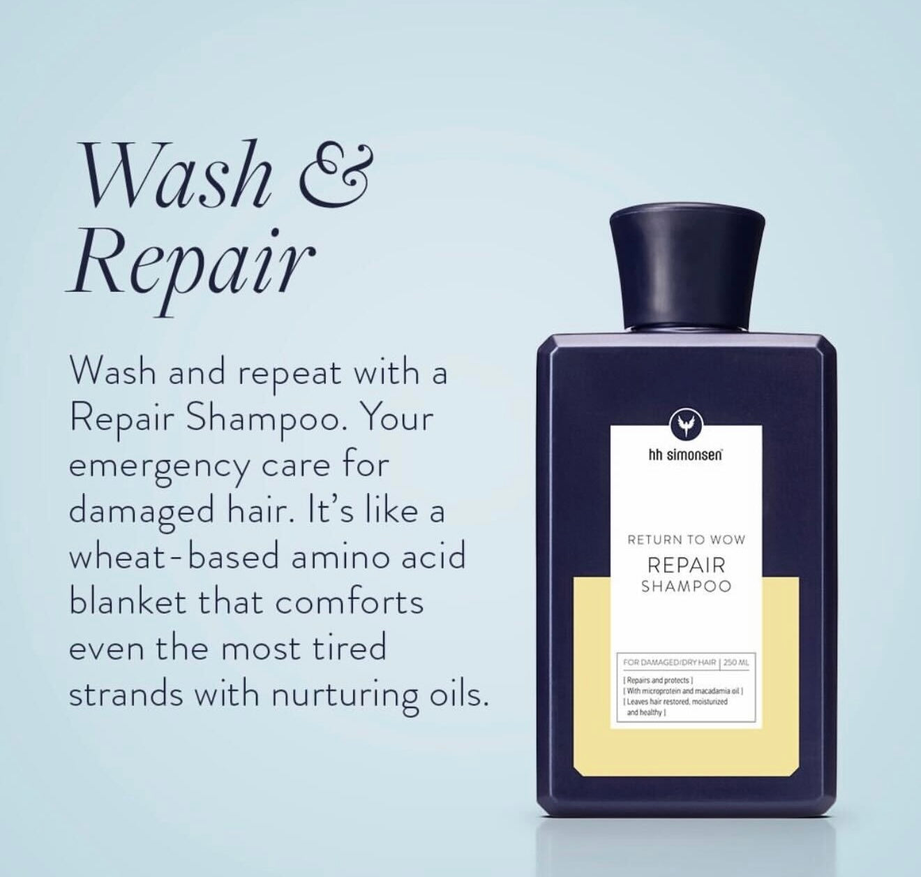 Repair Shampoo frá HH Simonsen er sérstaklega hannað fyrir skemmt eða illa farið hár. Sjampóið inniheldur míkró prótín sem innihalda hátt hlutfall af keratíni og fara djúpt inn í hárið og styrkja það innan frá. Amínósýrur og macadamia- og jojoba olíur næra hárið og styrkja það.