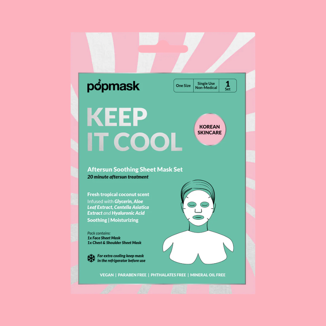 Keep It Cool Aftersun maska settið er bjarvættur fyrir brennda, þurra og erta húð. Maskarnir innihalda Aloe Vera og Hyaluronic sýru sem róar og sefar húðina eftir veru í sólinni.